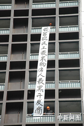 中新網(wǎng)貴港12月16日電 (記者 王剛)16日早,廣西貴港市數(shù)十農(nóng)民工爬上該市市區(qū)最高樓盤“聯(lián)邦國際”欲跳樓討薪,情緒激動的民工還掛出“最苦農(nóng)民工、最累購房人、最黑開發(fā)商”、“還我血汗錢”等橫幅聲討開發(fā)商。