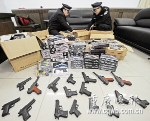 經(jīng)查,高個男子叫奉華(化名),今年32歲,在遂寧做玩具生意。前段時間聽朋友說,重慶某縣市場有仿真槍出售,仿真度高,價格便宜,他于是打算進貨來遂寧賣。經(jīng)多方聯(lián)系,奉華與重慶商家接上了頭。1月19日15時許,他與舅子蔣某(矮個男子)開車從遂寧前往重慶某縣,以4420元購買了382支仿真手槍后,準備運回遂寧,不想剛走到潼南,就被警方擋獲。