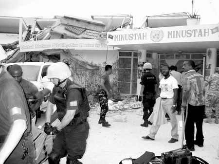 海地時間1月12日下午4時50分,太子港發(fā)生地震時,于江樺和在太子港工作的中國同事劉昆開車前往聯(lián)海團(tuán)總部大樓接一位美國同事。車子在大樓前還沒停穩(wěn),大家就覺得車子在晃,一樓已經(jīng)冒出大量白色灰塵并伴隨著轟鳴聲,于江樺和劉昆下車后趕緊向遠(yuǎn)離大樓的地方跑。由于地面在震顫,根本無法站立,倆人只好蹲下等地震停止。大約30秒鐘后,于江樺和劉昆轉(zhuǎn)過頭來,看到聯(lián)海團(tuán)總部大樓已經(jīng)完全坍塌。于江樺連忙掏出手機(jī)撥打隊(duì)長趙化宇的手機(jī),但此時信號已經(jīng)中斷。這時防暴隊(duì)長說:“我們的代表團(tuán)正在樓里開會!甭牭竭@個消息后,于江樺的頭一下子就蒙了。