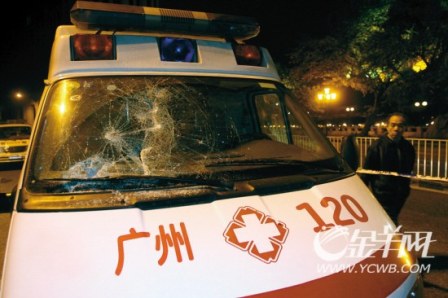 記者接報(bào)趕到現(xiàn)場(chǎng),在沿江西路中山大學(xué)附屬第二醫(yī)院大門前,一輛車身噴有“廣州紫荊醫(yī)院”字樣的救護(hù)車停在路邊,車頭的擋風(fēng)玻璃和右前門玻璃被砸爛,地上還留有砸車用的磚塊。紫荊醫(yī)院司機(jī)李先生雖然沒有被打傷,但是情緒還很激動(dòng)。他告訴記者,他們接到電話稱,有病人需要救護(hù)車轉(zhuǎn)送茂名,救護(hù)車在中山二院門口剛停下來,“前后各一臺(tái)越野車便把救護(hù)車夾住,車上沖下來十多人,有人手上還拿著砍刀!