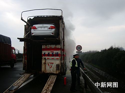 中新網(wǎng)寧波3月7日電(記者 何蔣勇 通訊員 樂其偉 歐陽峰)6日下午,一輛滿載著八輛豐田新車的半掛運(yùn)輸車在甬臺(tái)溫高速寧波段因剎車抱死引發(fā)輪胎起火,幸虧高速交警、消防及過往群眾的及時(shí)有效處置,才使八輛豐田新車躲過了此次火險(xiǎn)。