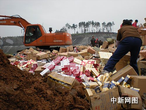 15日上午10時,伴隨著大型壓路機和挖掘機工作的隆隆聲,3萬多條假冒卷煙在宜昌市夷陵區(qū)丁家壩垃圾處理場被碾壓后填埋銷毀。