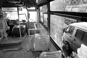 昨日17時,記者趕到現(xiàn)場。為了不使被砸的這輛25路公交車影響其它公交車發(fā)車,該車已經(jīng)從站點移開。被砸公交車的前風擋玻璃、前車門玻璃以及車兩側近10塊車玻璃被砸碎,車內滿地是玻璃碎片。