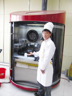 記者昨日在現(xiàn)場看到,“愛可2.0”高約2米,寬約1.8米,有拉門封閉,里面有特制的烹飪?cè)O(shè)備,有鍋,有自動(dòng)噴油、噴水、攪拌設(shè)備,與之相連接的是一個(gè)智能化觸摸屏,上面是系統(tǒng)控制界面。在正式烹飪前,早已“定量”好的主料、配料和作料都被放在專用盒子里。工作人員將“杭椒牛柳”的材料送入“愛可2.0”,在觸摸屏輸入程序,機(jī)器人開始工作。