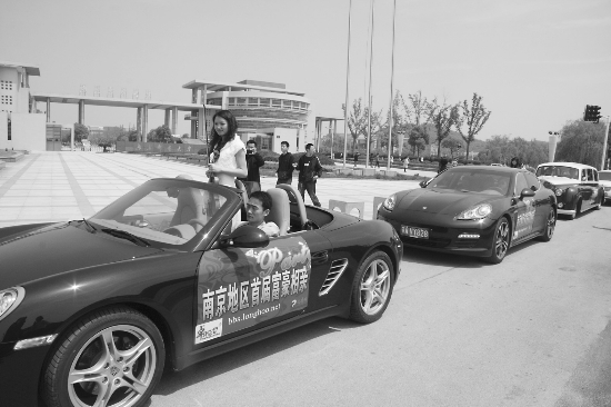 昨天上午9點(diǎn)多,3輛保時(shí)捷跑車依次駛至位于新模范馬路旁邊的南京郵電大學(xué)東門,每輛車的兩側(cè)車門均貼有大幅廣告,上面寫有“南京首屆富豪相親會(huì)”字樣。3輛名車停在路邊后,立即引來(lái)了無(wú)數(shù)路人圍觀,“平時(shí)在街頭偶而會(huì)看到一輛名車,3輛清一色的保時(shí)捷名車排在一起,真是少見(jiàn)!”市民程先生咂了咂嘴。