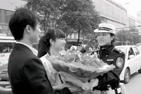 綿陽一對新人的婚車車隊(duì)在如潮的車流中難以前行,綿陽交警直屬一大隊(duì)女子警組民警吳莎了解情況后,開著交警流動(dòng)服務(wù)車引道,順利將車隊(duì)帶到酒店。昨日上午,新郎新娘抱著鮮花,幾經(jīng)周折找到“護(hù)嫁天使”吳莎,表示感謝。綿陽和成都市民紛紛撥打本報(bào)綿陽新聞熱線表示,交警吳莎為普通老百姓的婚車引道,既疏導(dǎo)了交通,又體現(xiàn)了交警的人性化執(zhí)法。