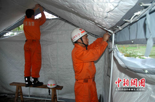 在重慶市墊江縣李白村九組,一頂藍色的救災帳篷經(jīng)過消防官兵的緊張搭建成形,災民湯強上前與消防官兵們緊緊握手,感激得熱淚盈眶……
