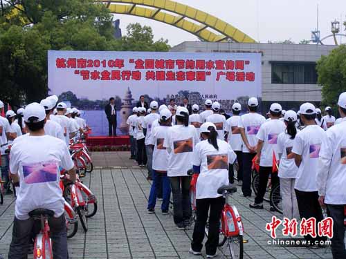 中新網(wǎng)杭州5月15日電(記者 趙曄嬌 實(shí)習(xí)生 徐進(jìn)軍)今天,杭州市“全國城市節(jié)約用水宣傳周”活動(dòng)在該市少年宮廣場舉行,由近五十名大學(xué)生組成的節(jié)水志愿者車隊(duì)騎著公共自行車環(huán)繞西湖,倡導(dǎo)“節(jié)水減排,綠色出行”,提高市民低碳意識。據(jù)悉,杭州水資源緊缺的矛盾日益嚴(yán)峻,僅去年末總蓄水量就較2008年同期減少10.14億立方米,相當(dāng)于減少近100個(gè)西湖的水量。