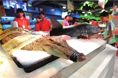 昨天,記者提出看超市出售鱷魚(yú)的相關(guān)證明,永輝超市的前臺(tái)負(fù)責(zé)人劉先生稱(chēng),超市從農(nóng)貿(mào)市場(chǎng)購(gòu)進(jìn)了鱷魚(yú)和鯊魚(yú),對(duì)方都提供了檢疫報(bào)告和許可證,“賣(mài)方提供相關(guān)證明,我們就能進(jìn)貨公開(kāi)銷(xiāo)售,超市不需要提供證明”。 (記者王奕)