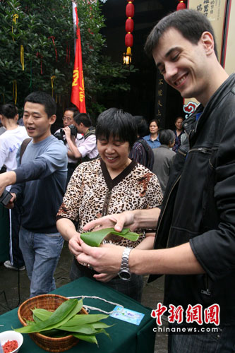 來自澳大利亞的尼克斯一家也成為現(xiàn)場的焦點。三個金發(fā)碧眼的小孩熟練地拿起粽葉包起了粽子。在不到半小時的時間內(nèi),僅有5歲的尼威廉就包了5個有模有樣的粽子出來,引得現(xiàn)場觀眾連聲叫好。據(jù)尼克斯夫人介紹,他們家三個小孩平時對中國文化都很感興趣,以前就學(xué)過包粽子。(完)