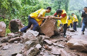 由于不清楚山體垮塌,不少車輛被十幾噸巖石擋住去路。眼看,車輛越堵越多,程運(yùn)富撥打110請(qǐng)交巡警疏導(dǎo)交通!氨欢碌亩v車倒車出去,約20分鐘后就沒(méi)再堵了!背踢\(yùn)富說(shuō),“好在巖石滾落時(shí)沒(méi)有車輛經(jīng)過(guò)!