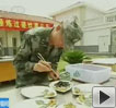 【解說】在觀眾的熱情邀請(qǐng)下,曹師傅又表演了一個(gè)他的拿手絕技,在氣球上切肉絲。氣球下面放著三根鋼針,肉放在氣球的上面,用刀切成粗細(xì)均勻的肉絲而氣球卻沒有破。讓市民真正感受到了大師的風(fēng)采。