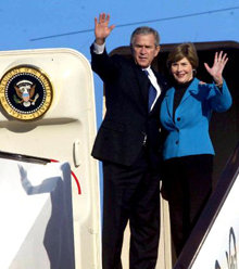 圖:美國(guó)總統(tǒng)布什夫婦走下舷梯