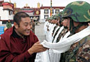 拉薩大昭寺僧人向武警官兵敬獻(xiàn)哈達(dá)