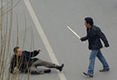 不法分子手持棍棒襲擊一名摔倒的男子