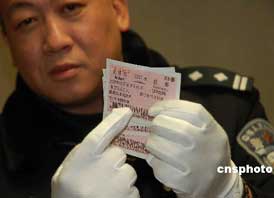 假票主要有“回頭票”、“補、涂改票”、“整版假票”三種;仡^票一般票面較舊,且已被剪口;補、涂改票由于刮掉了一部分纖維,顏色會有些發(fā)白,整個票面顏色不統(tǒng)一;而假票票面“中國鐵路”標(biāo)志以及背面的水印較為模糊,用手輕揉票面文字及數(shù)字時,油墨即會沾在手上。