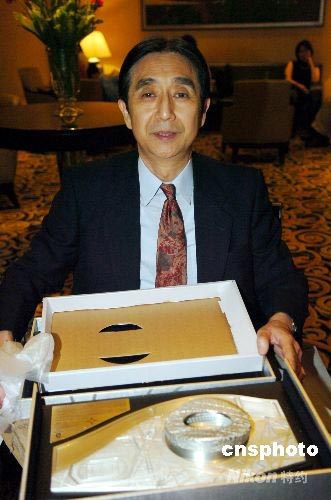 日本友人展示胡錦濤贈(zèng)予的鳥巢模型
