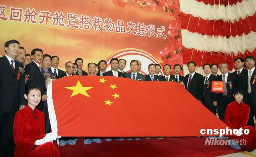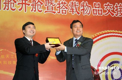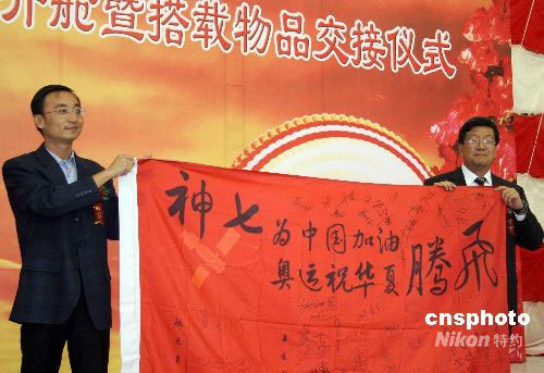 圖:“神七”載人飛船總設計師張柏楠移交返回艙搭載簽名旗幟