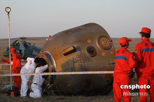 圖:搜救隊員到達神七返回艙著陸現(xiàn)場