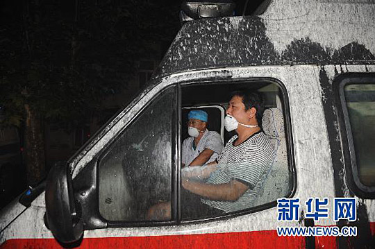 圖:大連新港輸油管道爆炸起火 救護(hù)人員在事故現(xiàn)場