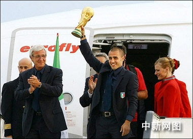 中新網(wǎng)7月12日電 據(jù)新京報報道,第四次登頂世界杯的意大利隊(duì)昨天凌晨乘坐專機(jī)回到了祖國,當(dāng)飛機(jī)在羅馬郊區(qū)的海軍機(jī)場著陸后,一場席卷意大利全國的慶;顒永_了序幕。意大利隊(duì)全體成員被授予共和國勛章。
