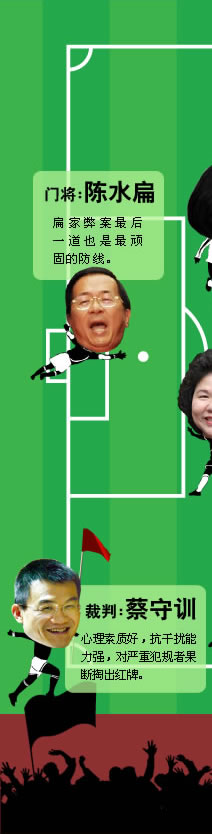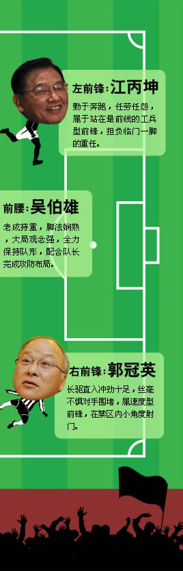 2009年大幕即將落下,臺(tái)灣政壇照舊精彩紛呈,多路人馬粉墨登場(chǎng)。在這個(gè)情節(jié)跌宕起伏、堪比“足球甲級(jí)聯(lián)賽”的舞臺(tái)上,眾“球員”充分展示出個(gè)人技術(shù)和力量。中新網(wǎng)特別從各支“參賽隊(duì)伍”中精挑細(xì)選,組成“本年度全明星陣容”,藉此梳理臺(tái)灣政壇發(fā)生的那些人和事,以饗諸位“球迷”。