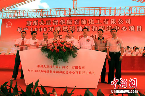 總投資53.9億元人民幣,設(shè)計(jì)年生產(chǎn)能力達(dá)1000萬噸的廣東惠州大亞灣華瀛石油化工有限公司燃料油調(diào)和配送中心項(xiàng)目9日正式動(dòng)工建設(shè)。該項(xiàng)目是廣東省重點(diǎn)項(xiàng)目,建成投產(chǎn)后或?qū)⒊蔀橹袊畲笕剂嫌驼{(diào)和配送中心。 圖為惠州市委書記黃業(yè)斌宣布惠州大亞灣華瀛石油化工有限公司燃料油調(diào)和配送中心項(xiàng)目開工?敌⒕ 攝