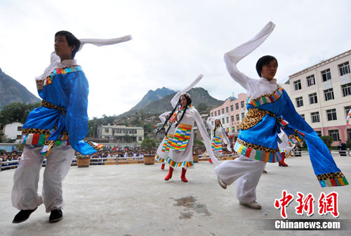 9月30日,甘肅舟曲縣第三初級(jí)中學(xué)舉行迎國(guó)慶61周年文藝匯演,祝福祖國(guó)更加強(qiáng)盛。今年8月8日,舟曲遭遇特大山洪泥石流地質(zhì)災(zāi)害,經(jīng)過(guò)1月多的搶險(xiǎn)救災(zāi)工作,舟曲救災(zāi)工作已步入轉(zhuǎn)型,如今的縣城,多數(shù)商戶恢復(fù)營(yíng)業(yè),學(xué);謴(fù)教學(xué)秩序。