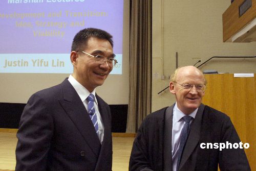 世界頂級(jí)經(jīng)濟(jì)學(xué)講壇之一的劍橋大學(xué)“馬歇爾講座”每年邀請(qǐng)一位世界著名經(jīng)濟(jì)學(xué)家擔(dān)任主講人,北京大學(xué)中國(guó)經(jīng)濟(jì)研究中心林毅夫教授作為首個(gè)中國(guó)學(xué)者今年應(yīng)邀主講。中新社發(fā) 李鵬 攝