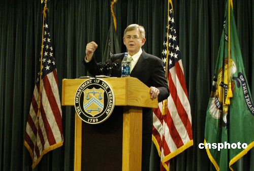美國(guó)財(cái)政部12月7日舉行記者會(huì),該部中國(guó)事務(wù)特使霍爾默(Alan Holmer)在記者會(huì)上透露,下周美國(guó)財(cái)長(zhǎng)保爾森將率團(tuán)前往北京出席第三次中美戰(zhàn)略經(jīng)濟(jì)對(duì)話,美方代表團(tuán)成員包括商務(wù)部長(zhǎng)古鐵雷斯、衛(wèi)生與公共服務(wù)部長(zhǎng)萊維特、貿(mào)易代表施瓦布、環(huán)保署長(zhǎng)約翰遜、代理農(nóng)業(yè)部長(zhǎng)康納等高級(jí)官員。中新社發(fā) 邱江波 攝