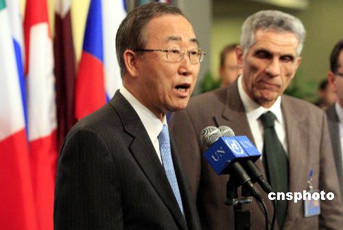 聯(lián)合國秘書長潘基文(左)二十七日發(fā)表聲明,對巴基斯坦前總理、人民黨領(lǐng)袖貝·布托遇刺表示“震驚和憤怒”。他呼吁巴人民在此“困難時期”保持冷靜和克制,為和平和民族團(tuán)結(jié)共同努力。中新社發(fā) 李靜 攝