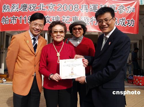 當(dāng)?shù)貢r(shí)間1月1日下午,南加州華人社團(tuán)聯(lián)合會(huì)舉行派對(duì),慶祝北京奧運(yùn)玫瑰花車在美國(guó)洛杉磯第119屆帕薩迪娜玫瑰花車游行中勇奪“最佳主題大獎(jiǎng)”。參加玫瑰花車表演的北京二中學(xué)生、中國(guó)雜技團(tuán)和中國(guó)京劇院演員122人露出勝利歡笑。北京奧運(yùn)組委會(huì)新聞宣傳部長(zhǎng)蕭培向南加州華人社團(tuán)聯(lián)合會(huì)主席張素久頒感謝狀,感謝華人華僑對(duì)北京奧運(yùn)的支持。中新社發(fā) 盧威 攝