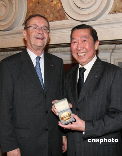 當?shù)貢r間1月7日,法國納伊市市長巴依向旅法僑界知名華裔人士何;(右)頒授榮譽獎?wù),以表彰他為促進法中友好與合作及亞裔融入法國社會做出的積極貢獻。與法國總統(tǒng)薩科奇相識三十多年的何;,是該市的一位知名人士,2007年底薩科奇首次訪華時,何福基曾作為代表團中唯一的華裔人士隨同訪問。中新社發(fā) 鐘誠 攝