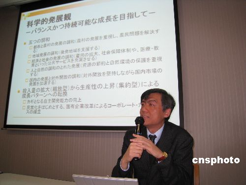 1月19日,由早稻田大學中國塾(研究會)主辦的2008年新春演講會,在早稻田大學國際會議中心舉行,百余人與會。旅日華人學者、知名中國經(jīng)濟專家關志雄博士進行演講。圖為關志雄在介紹中國的科學發(fā)展觀。中新社發(fā) 段躍中 攝