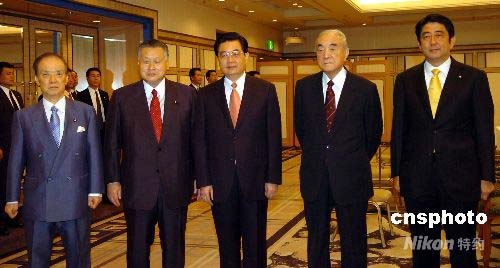 5月8日,正在日本進(jìn)行國事訪問的中國國家主席胡錦濤與中曾根康弘、森喜朗、海部俊樹、安倍晉三等四位日本前首相共進(jìn)早餐。胡錦濤高度評價各位先生在首相任內(nèi)及任后為發(fā)展中日友好所作的積極努力。中新社發(fā) 朱沿華 攝