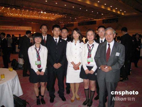 5月14日晚,由日本財(cái)團(tuán)法人日中友好會館、社團(tuán)法人日中友好協(xié)會主辦的歡迎中國高中生400人訪問團(tuán)酒會在東京舉行。作為2008年“二十一世紀(jì)東亞青少年大交流計(jì)劃”的第二批,他們將參加與日中關(guān)系相關(guān)的研討會,走進(jìn)日本高中課堂,在日本高中學(xué)生家庭住宿外,還將進(jìn)行文化、經(jīng)濟(jì)、社會等方面的考察。圖為出席酒會的四川高中生和日中友好會館谷野作太郎副會長合影。中新社發(fā) 段躍中 攝