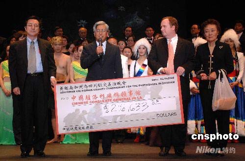 當(dāng)?shù)貢r間五月十五日晚,南加州華僑華人在洛杉磯縣圣蓋博市舉行為四川地震災(zāi)區(qū)賑災(zāi)義演晚會,當(dāng)?shù)厝A僑華人、社團、企業(yè)和留學(xué)生等當(dāng)場為災(zāi)區(qū)捐款二十一萬多美元。圖為中國駐洛杉磯總領(lǐng)事張云(前左二)表示,總領(lǐng)館將盡快把善款轉(zhuǎn)交給地震災(zāi)區(qū)。中新社發(fā) 張煒 攝