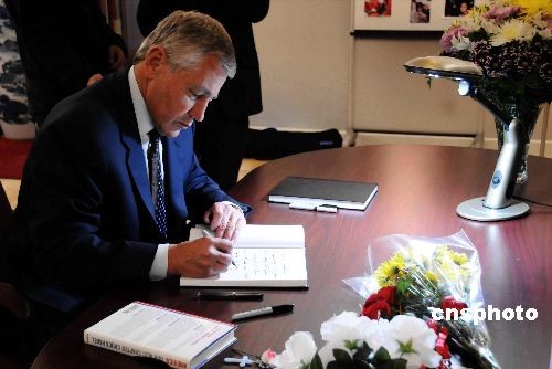 美國國會(huì)參院外交關(guān)系委員會(huì)成員、聯(lián)邦參議員恰克·黑格爾,當(dāng)?shù)貢r(shí)間五月十九日傍晚來到中國駐美國大使館悼念中國四川大地震遇難者。圖為黑格爾參議員在悼念紀(jì)念冊(cè)上留言:我為那些在四川大地震中遇難的中國人民感到悲痛,我堅(jiān)信中國人民在政府的支持下能夠克服目前的困難。
