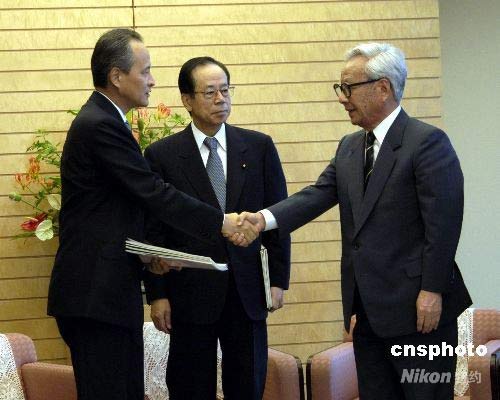 6月12日,在東京的日本首相官邸,日本有關(guān)方面向中方贈(zèng)送坂神地震重建資料以供中國四川大地震災(zāi)后重建參考。日本首相福田康夫,中國駐日本大使崔天凱,前兵庫縣知事、紀(jì)念兵庫震災(zāi)21世紀(jì)研究機(jī)構(gòu)理事長貝原俊民(右)等出席贈(zèng)送儀式。中新社發(fā) 朱沿華 攝