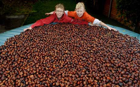 英國兩個小兄弟日前用2周的時間收集了7500多個七葉樹果實,他們希望此舉夠創(chuàng)造吉尼斯世界紀(jì)錄。