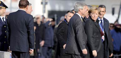 貝盧斯科尼撇開歡迎委員會的工作人員,藏在一個街燈柱后面。當(dāng)?shù)聡偫砟藸栕呦聦\,要進(jìn)入他們會面的地區(qū)委員會總部時,他突然從街燈柱后面跳出來,嘴里還喊著“咕咕”。據(jù)說默克爾看起來很開心,與貝盧斯科尼擁抱,并且親切地稱其“西爾維奧” 。