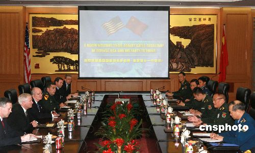 十一月五日,中華人民共和國中央軍委副主席、國務(wù)委員兼國防部長曹剛川在北京與美國國防部長羅伯特·蓋茨舉行會(huì)談。中新社發(fā) 廖文靜 攝