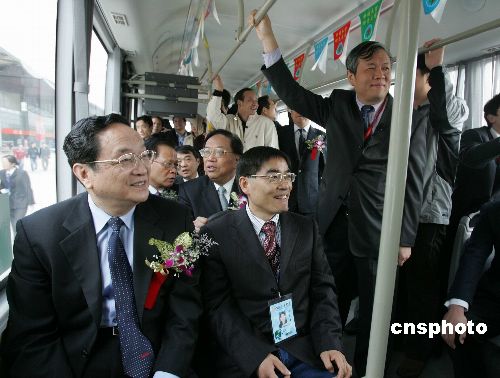 十一月六日,中共中央政治局委員、上海市委書記俞正聲(左)視察“2007中國國際工業(yè)博覽會”,并乘坐新能源公共汽車。據(jù)悉,這是俞正聲履新上海后,首次出席大型公眾活動。中新社發(fā) 潘索菲 攝