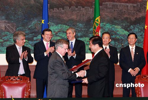 十一月二十八日,北京人民大會堂,中國國務院總理溫家寶會見歐盟輪值主席國葡萄牙總理索克拉特斯(后左三)與歐盟委員會主席巴羅佐(后左二),并在會見后共同出席中國與歐盟三項合作文本的簽字儀式。中新社發(fā) 廖文靜 攝
