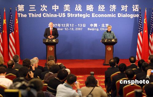十二月十三日,第三次中美戰(zhàn)略經(jīng)濟(jì)對(duì)話在北京閉幕,中國(guó)國(guó)務(wù)院副總理吳儀與美國(guó)財(cái)長(zhǎng)保爾森共同會(huì)見記者。中新社發(fā) 毛建軍 攝