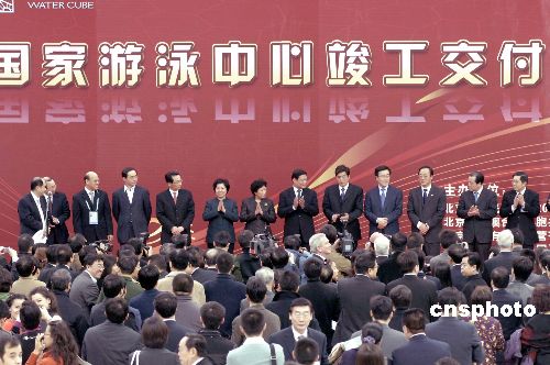 1月28日,作為北京奧運(yùn)會標(biāo)志性場館的國家游泳中心(“水立方”)宣布竣工。北京市委書記劉淇、市長郭金龍等出席竣工儀式。這個歷時4年多時間建成的水藍(lán)色建筑即將投入“好運(yùn)北京”賽事使用。中新社發(fā) 徐曦弋 攝