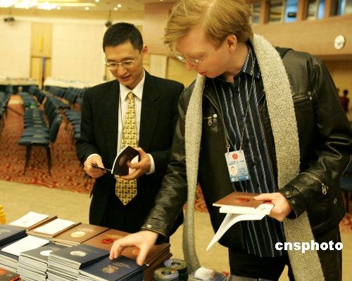 三月一日,俄羅斯國(guó)際文傳電訊社記者艾瑞克(右),在北京梅地亞“全國(guó)兩會(huì)”新聞中心領(lǐng)取采訪證件時(shí),對(duì)該中心提供的參考書籍和資料興趣濃厚。今年“全國(guó)兩會(huì)”新聞中心特意為外國(guó)記者提供眾多書籍和資料,以方便他們采訪報(bào)道時(shí)進(jìn)行參考。中新社發(fā) 潘索菲 攝