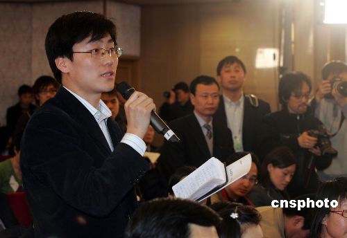 在北京人民大會(huì)堂舉行的全國(guó)政協(xié)十一屆一次會(huì)議首場(chǎng)新聞發(fā)布會(huì)上,中新社記者徐長(zhǎng)安向大會(huì)新聞發(fā)言人吳建民提問(wèn)。中新社發(fā) 潘索菲 攝