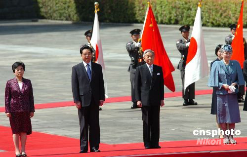 5月7日,日本明仁天皇與皇后美智子在皇宮為正在日本進行國事訪問的中國國家主席胡錦濤及夫人劉永清舉行了歡迎儀式。圖為天皇夫婦與胡錦濤夫婦在歡迎儀式上。中新社發(fā) 朱沿華 攝