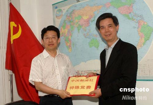 6月3日,中國新聞社社長郭招金(右)將本社全體中共黨員自愿交納的支援四川地震災(zāi)區(qū)特殊黨費,上交有關(guān)部門。這筆特殊愛心捐款,將轉(zhuǎn)交四川地震災(zāi)區(qū)幫助當(dāng)?shù)厝嗣窨拐鹁葹?zāi)、重建家園。中新社發(fā) 鄒憲 攝